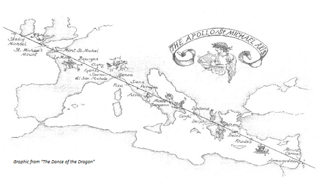 Mówi się, że linia ta prowadzi, na mapie w odwzorowaniu Merkatora, z Mont Carmel w Izraelu, poprzez wyspę Delos (poświęconą Apollo), Delphi, Korfu (wyspę Artemidy), Monte Gargano w południowych Włoszech (znane jako miejsce wielu objawień), La Sacra di San Michele w Piemoncie (klasztor Benedyktynów na wysokości 1000m), Le Mont St. Michel w Normandii, Saint Mikael’s mount (skalista wyspa u wybrzeży Kornwalii) oraz Skellig Michael, wyspa na południowy wschód od Irlandii. Kąt osi zorientowany jest z Południowego Wschodu na Północny Zachód, co odpowiada zodiakalnej osi panna-ryby.